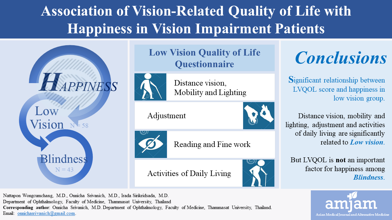 Methods: This pilot study enrolled 101 impairment patients at ophthalmology department, Thammasat University Hospital in 2021. Oxford happiness questionnaire was assessed by impairment patients. In details, distance vision, mobility and lighting, adjustment, reading and fine work, and activities of daily living were evaluated using Low Vision Quality of Life (LVQOL) questionnaire and demographic data were collected using data sheet.